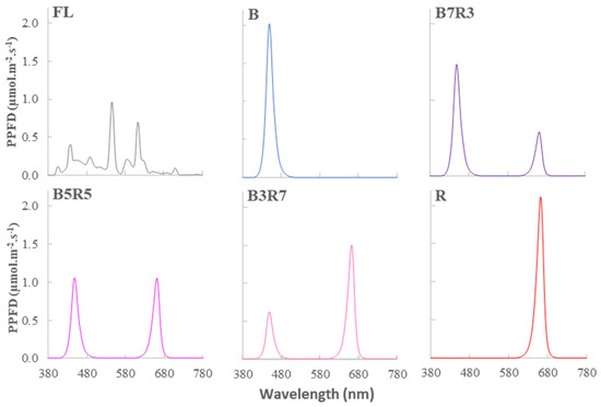 The spectra of photosynthesis photon flux densities of light treatments used in this study. All light treatments were at the same PPFD of 50 μmol·m−2·s−1.