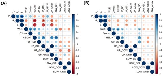 Correlation matrix for among physiological and stomatal morphological traits (A) under drought stress and (B) plasticity in KDML105-CSSLs. Positive and negative correlations are illustrated in blue and red circles, respectively. Color shade and circle size are proportional to the correlation coefficients, with their values shown in the color intensity bar. Significance level is indicated as * (p < 0.05 ‘*’, p < 0.01 ‘**’, p < 0.001 ‘***’); Net photosynthesis rate (Pn); Stomatal conductance (gs); Transpiration rate (E); Intrinsic water-use efficiency (IWUE); Maximum PSII quantum yield (QYmax); Rice height (HEIGHT); Upper stomatal density (UP_SD); Upper guard cell length (UP_GCL); Upper guard cell width (UP_GCW); Upper maximal pore area (UP_Amax); Lower stomatal density (LOW_SD); Lower guard cell length (LOW_GCL); Lower guard cell width (LOW_GCW); Lower maximal pore area (LOW_Amax).