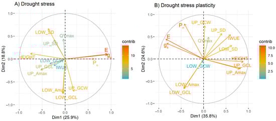 Trait loading scores of the physiological and stomatal traits for each principal component under two conditions; (A) drought stress and (B) drought stress plasticity.