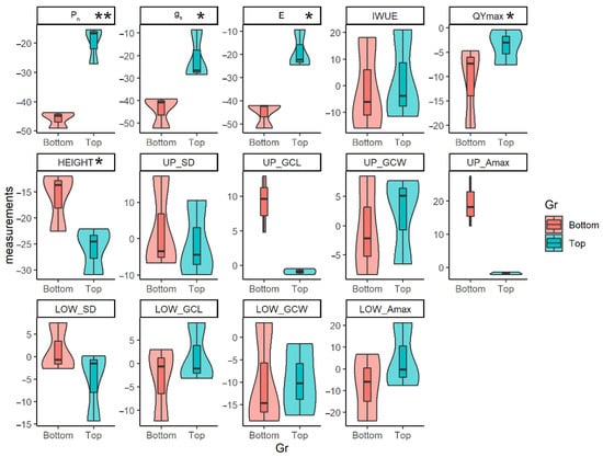 Violin plots of physiological and stomatal traits in drought stress plasticity between two groups of rice; the top (best-performing lines) and bottom (worst-performing lines) groups were represented in pink and blue, respectively (p < 0.05 ‘*’, p < 0.01 ‘**’).