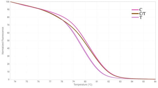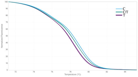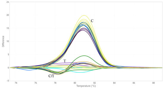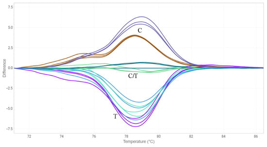 HRM analysis for the C-to-T mutation in exon 5 of FAD3A gene for oligonucleotide standards. C—standard without the mutation; T—standard with the mutation; C/T—standards with and without the mutation in 1:1 ratio.