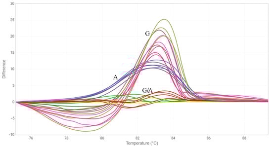 HRM analysis for the G-to-A mutation in exon 1 of FAD3A gene for oligonucleotide standards. G—standard without the mutation; A—standard with the mutation; G/A—standards with and without the mutation in 1:1 ratio.