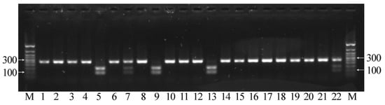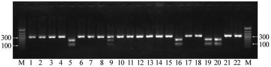 Results of CAPS analysis for the C-to-T mutation in exon 2 of FAD3B for individual plants of line AGT 981/05. If the mutation is absent, two fragments with the lengths of 157 and 103 bp were visualized (lines 5, 9, 13), while if the mutation is present, one fragment with a length of 260 bp was visualized (lines 1–4, 6, 8, 10–12, 14–21). In the case of heterozygosity for the studied mutation, three DNA fragments were visualized, corresponding to the initial length of the amplicon and two of its parts after restriction (lines 7, 22). M—50 bp ladder.