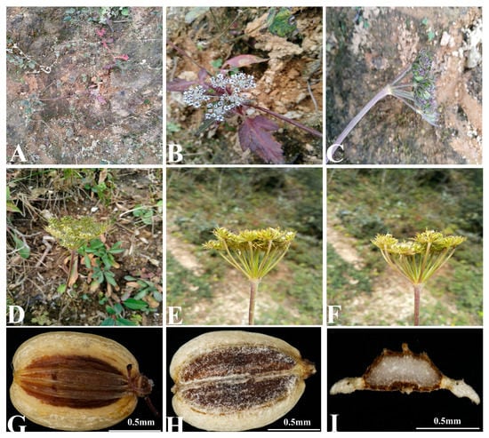 Illustrations of Peucedanum franchetii. (A) Habit; (B) basal leaves; (C) stem leaves; (D) umbel with bracts and bracteoles; (E) flower; (F) young mericarp with calyx teeth; (G) dorsal of mericarp; (H) commissural of mericarp; (I) cross-section of mericarp. Scale bars: 0.5 mm (G,H,I).