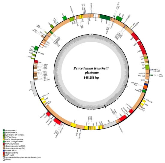 The length of the complete plastome sequence in P. franchetii was 148,281 bp and displayed a typical quadripartite structure (Figure 2), containing one LSC region (92,298 bp) and one SSC region (17,691 bp) separated by a pair of IR regions (19,146 bp). Moreover, the total GC content was 37.5%. The plastome encoded 113 unique genes, and these genes had four categories: self-replication, genes for photosynthesis, other genes, and genes of unknown function. Among them, 15 genes harbored a single intron, and 3 genes (ycf3, clpP, and rps12) had 2 introns (Table S2).