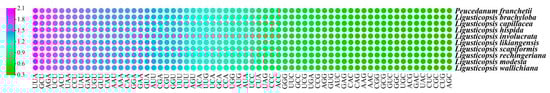 Our study summarized the codon usage frequency of 79 protein-coding genes among the 10 plastomes. The result demonstrated that codon usage bias was similar in them. The 79 protein-coding genes encoded 22,632–22,553 codons. In these codons, the Leu was encoded by the highest number of codons 2399–2410 (10.64%–10.65%), while the Cys was the least 231–237 (1.02–1.05%) (Table S3). Figure 3 showed the relative synonymous codon usage (RSCU) values of all protein-coding genes for the ten plastomes. The RSCU values ranged from 0.34 to 2.00. The UAA codon possessed the highest value (RSCU = 2.0) in the P. franchetii, L. brachyloba, L. capillacea, and L. scapiformis plastomes, while the AGC codon possessed the smallest value (RSCU = 0.34) only in the L. involucrata plastome. The RSCU value of codons AUG and UGG was 1.00 (Table S3). In addition, the RSCU values of 30 codons were greater than 1.00, and these codons were ended with A/U, except UUG in ten plastomes.