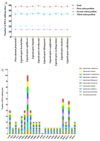 The RNA editing sites in ten plastomes. (A) Numbers of RNA editing sites distributed in different codon positions; (B) numbers of RNA editing sites presented in genes.