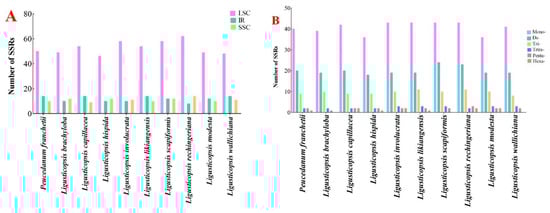 Analyses of simple sequence repeats (SSRs) in ten plastomes. (A) Presence of SSRs in LSC, SSC and IR; (B) numbers of different repeat types.