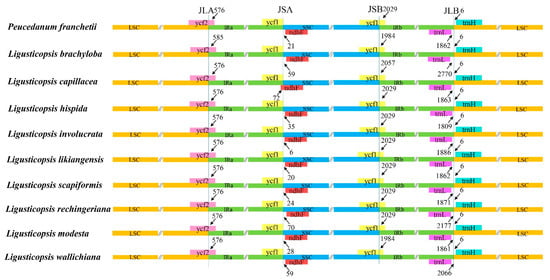 Comparison of the border positions of LSC, SSC, and IR regions across the ten plastomes. Functional genes and truncated fragments are denoted by colored boxes. The sizes of gene fragments located at boundaries are indicated by the base pair lengths.