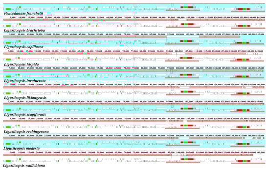 The study also compared P. franchetii plastome with nine Ligusticopsis plastomes. For the ten plastomes, the overall size ranged from 147,752 bp (L. involucrata) to 148,633 bp (L. brachyloba). They hold the same unique gene number, comprising 79 protein-coding genes, 30 tRNA genes, and 4 rRNA genes. The overall GC content was corresponding in the ten plastomes (37.3–37.5%). Hence, the structure of the plastome appeared to be largely conserved across the ten species (Table 1).