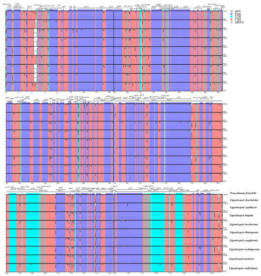 The Mauve result demonstrated that the gene arrangement was highly conservative and, moreover, the gene retained a similar sequence among the ten plastomes (Figure 7 and Figure 8).