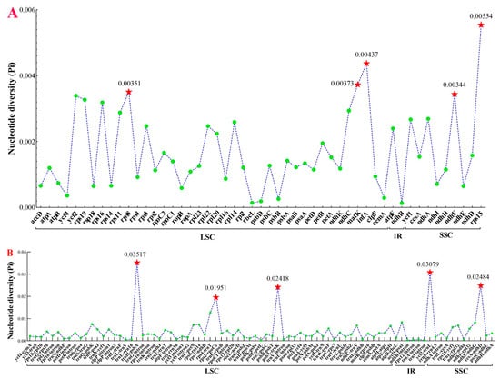 Comparative analysis of the nucleotide diversity (Pi) values among the ten plastomes. (A) protein-coding genes; (B) non-coding and intron regions.