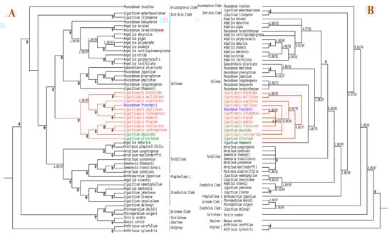 P. franchetii was regarded as a synonym of L. likiangensis in the World Flora plant list (http://worldfloraonline.org, accessed on 10 December 2022). However, our results did not support this treatment. Although P. franchetii was a sister to L. likiangensis in the ITS topology, this species clustered with L. capilliacea in the plastome tree. Moreover, obviously different morphological characters were detected for the both species. The absent bracts and pinnate and linear coexisted bracteoles were observed in P. franchetii, while pinnate and linear coexisting bracts and pinnate bracteoles were found in L. likiangensis (Table S6). Therefore, merging P. franchetii into L. likiangensis was inappropriatem and P. franchetii should be regarded as a dependent species of genus Ligusticopsis.