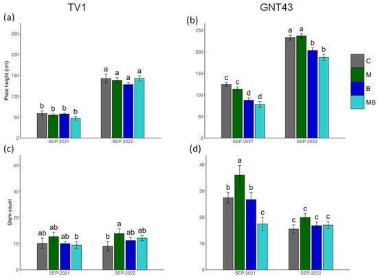The impact of selected agrotechnical treatments on number of stems or plant height of TV1 (a and c, respectively) and GNT43 (b and d, respectively). Tested treatments: control (C), plastic mulch (M), biochar (B), and plastic mulch + biochar (MB). Presented values are means ± SD (n = 24; 6 measurements per plot, 4 plots per variant). Means followed by the same letter in a chart are not significantly different from each other using the LSD test (p ≤ 0.05).