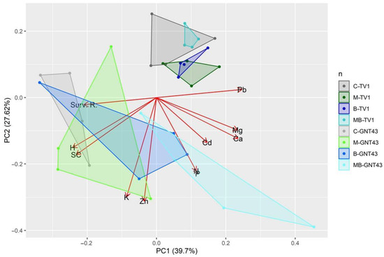The principal component analysis confirmed to some extent the absence of a significant influence of the agrotechnical measures applied on the growth and development of the hybrid TV1 (Figure 4). All cases within the treatments are clustered with a small distance between each other, and the formed groups overlap. However, different analysis results were obtained for the GNT43 hybrid. The agrotechnical treatments applied had a significant negative influence on the growth of the plants of this hybrid and led to an increased accumulation of metals in the shoots. The PCA also shows that the variation in TV1 between treatments is lower compared to GNT43.