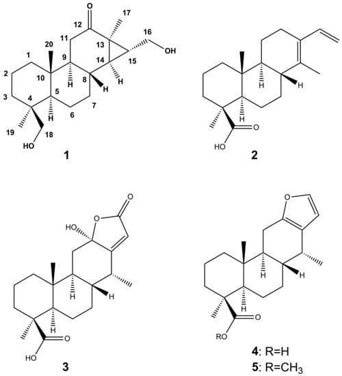 Chemical structures of isolated compounds deacetylchagresnone (1), cassa-13(14),15-dien-oic acid (2), isoneocaesalpin H (3), (+)-vouacapenic acid (4), and (+)-methyl vouacapenate (5).