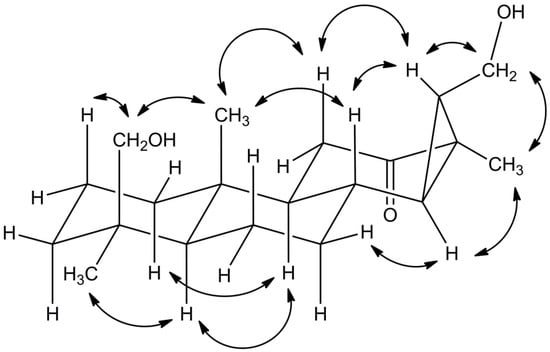 A literature search for corresponding compounds yielded the hydrolyzation product of chagresnone, which was previously isolated from Myrospermum frutescens (Fabaceae) [19]. The NMR data of compound 1 matched perfectly with the reported values. However, the proposed α-orientation of the cyclopropyl group, which was not based on respective NOESY correlations, was not supported by our experiments. For example, no correlations were observed between H-8 and neighboring H-14 or CH3-17, respectively. In contrast, NOESY correlations supported the β-orientation of the cyclopropyl group, as demonstrated by the coupling of H-15 with H-8 and H-11a or the coupling of H-14 with H-7b, respectively (Figure 2). Therefore, the cyclopropyl group had to be β-oriented, and H-14, as well as CH3-17, had to be α-oriented instead, as was the CH2-16 methylene group. Thus, the structure of compound 1 was established as (14R,16R,18S)-16,18-dihydroxy-14,15-cyclopimaran-12-one.