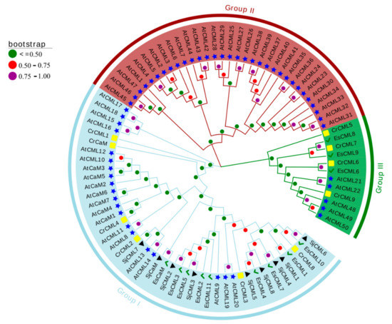 Figure 2. Phylogenetic analysis of the CaM/CML family of proteins amongst diverse species. The phylogenetic tree was constructed based on the sequence alignments by the ML method with bootstrapping analysis (1000 replicates) of the CaMs/CMLs proteins. The ML phylogenetic tree was created using ATGC PhyML 3.0. The proteins have been divided into three groups, each filled with a different color. Different colors and shapes represent different species. Black triangle, Saccharina japonica; green checkmark, Ectocarpus sp.; yellow box, Chlamydomonas reinhardtii; blue star, Arabidopsis thaliana. Different colored circles represent different bootstrap values.
