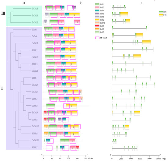 The nine SjCaM/CML genes were distributed on seven chromosomes in the genome. Both chromosome 0 and chromosome 12 contained two SjCMLs, and the other five chromosomes contained only one SjCaM/SjCML, respectively (Figure S1). The distance between two SjCML genes on the same chromosome was far >150 kb, which indicated that the tandem duplication region was not formed among the SjCaM/CML genes in this study. Meanwhile, the segmental duplication event was not detected using the MCScanX method with E-value < 1 × 10−10. The twelve EsCaM/EsCML genes were distributed on eight chromosomes, and we also did not detect tandem duplication and segmental duplication in E. sp.