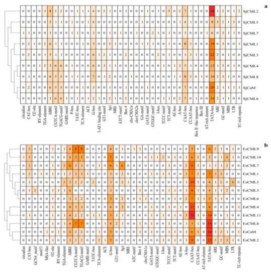 Figure 4. Analysis of the cis-acting elements of SjCaM/SjCMLs (a) and EsCaM/EsCMLs (b). The gradient colors in the orange grid represent the number of cis-acting elements in CaMs/CMLs.