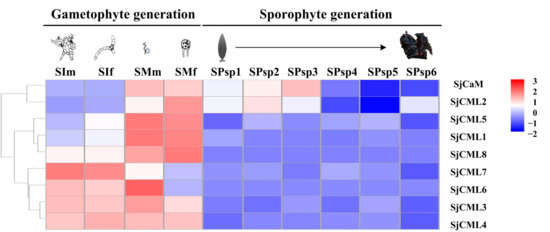 Figure 5. Expression patterns of SjCaM/SjCMLs during different life cycle stages. Log2-transformed values to generate heatmaps. SIf: immature female gametophytes; SIm: immature male gametophytes; SMf: mature female gametophytes; SMm: mature male gametophytes. SPsp1-SPsp6: six sporophyte developmental stages.