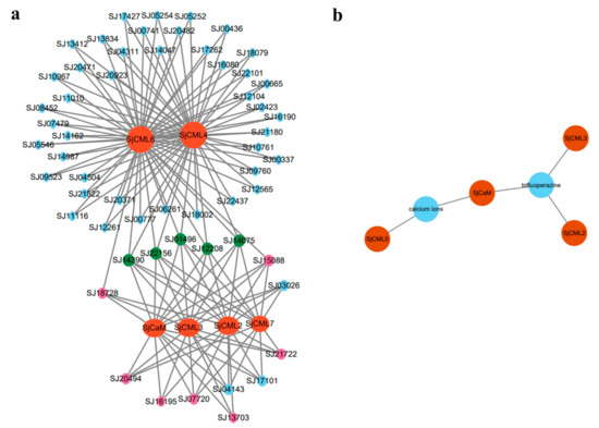 Figure 6. Interaction analysis of SjCaM/SjCMLs using the STRING and STITCH servers. The networks (a) show the protein–protein interactions. The red circle identifies SjCaM/SjCMLs, the blue circle identifies SjCaM/SjCMLs interacting proteins, the pink circle identifies calcineurin-like phosphoesterases, the green circle identifies five proteins interacting with all six SjCaM/SjCMLs. The networks (b) show the protein–chemical interactions. The red circle identifies SjCaM/SjCMLs and the bule circle identifies predicted interacting chemicals.