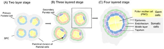 Illustration of anther differentiation and development in plants. (A). Cross section of the anther with two-layered somatic walls of epidermis and primary parietal cell layer (two-layered stage). Sporogenous cells (SPCs) and primary parietal cells are produced from archesporial cells in the hypodermis. The primary parietal cells periclinally divide and produce secondary parietal cells inside and endothecium outside, while SPCs proliferate mitotically. (B). The anther at its three-layered stage. Secondary parietal cells periclinally divide and produce a tapetum inside and a middle layer outside. (C). The anther is comprised of four concentric somatic layers: the epidermis, endothecium, middle layer, and tapetum from inside to out, respectively, as well as pollen mother cells (PMCs), developed from SPCs, at the central locule.