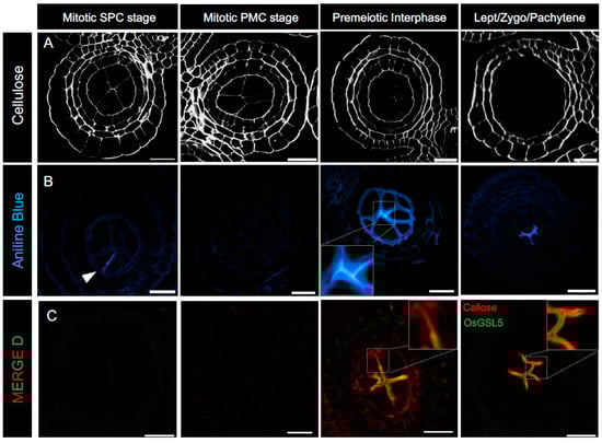 Transition to meiosis in flowering plants entails extensive remodeling of germ cell walls, whereby the cellulosic PMC walls are drastically rearranged and replaced by cell wall β-1,3-glucan polymer, called callose [74]. In anthers, SPCs proliferate mitotically and asynchronously, and a typical callose deposition is visible only at the dividing cell plates of SPCs (Figure 2). During the pre-meiotic interphase, i.e., just before meiosis entry, pre-existing cellulose in mature SPC/PMC walls begins to disappear gradually. In parallel to this, a considerable amount of callose is secreted from PMCs to completely fill the extracellular spaces of anther locules and give a “callosic barrier” appearance in the central locule (Figure 2 and Figure 3). In fact, some primitive studies have suggested that callose deposits in meiotic anthers act as a barrier or “molecular filter” to transmit signals important for meiosis, in addition to mechanical isolation of meiocytes from surrounding somatic tissues of anthers [75,76] and ovaries [77,78], although later studies have called into question the impermeable nature of callose [79,80]. Other research have suggested that callose functions as a protective layer for developing sporocytes from the influence of surrounding somatic cells [81,82] and that it helps in preventing the fusion of PMCs during meiosis and aids in the release of microspores from tetrads [83].