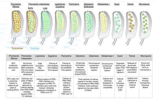 Callose deposition along with anther development from premeiosis to microspore stages. Cartoons depict callose (blue) and cellulose (brown) accumulation in pre-meiotic, meiotic, and post-meiotic anther locules as in microsporangium, based on the observations by Somashekar et al. [73] Overlap of callose and cellulose can be seen in dividing cell plates (Dyad and Tetrad). The below table shows the key meiotic and post-meiotic events taking place at each stage (upper) in correspondence to callose and cellulose remodeling shown in A (bottom). SPC—sprorogenous cells; PMC—pollen mother cells; TC—tapetal cell; PD—plasmodesmata; MT—microtubule; DSB—DNA double strand break; SC—synaptonemal complex; CC—cytomictic channels; PCD—programmed cell death. Colored asterisks indicate callose and cellulose in corresponding colors shown in cartoon.