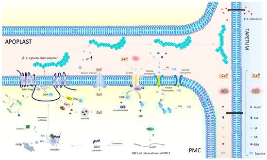 In premeiotic interphase anthers, callose fills the extracellular spaces as encasing PMCs, while OsGSL5 specifically localizes at the plasma membranes (PMs), where PMCs face each other (Figure 2, Panel C). Such a distribution pattern observed in premeiotic and early meiotic anthers argues that the PMC-PMC junction functions as the callose biosynthetic center and further indicates that PMCs have some polarity defined by the heterogeneous distribution of OsGSL5 and callose during premeiosis and meiosis, although the biological meaning of this polarity is enigmatic. Such an uneven distribution of PM-anchored GSL proteins seen in premeiotic anther locules is also found at the tip of elongating pollen tubes (PTs), where the secretary vesicles concentrated at the tip correspond to callose and GSL accumulation [90,91,92,93]. Furthermore, actin filaments, highly concentrated at PT tips, termed “actin fringe”, move along the calcium gradient and synergistically control the cell polarity of PTs [94,95]. In fact, Ge et al. (2009) have reported increased calcium precipitates in the callose walls during meiosis onset in tobacco anthers [96]. Thus, it is possible that similar actin fringe-like organization and/or Golgi-derived vesicle concentration due to increased calcium concentration in premeiotic anthers may be driving the GSL5 polarity (Figure 4). Exocysts are also suggested to be carriers of callose synthases [97], though this idea has yet to be evidenced in anthers.