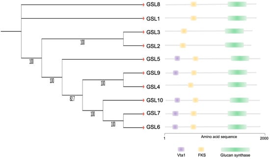 Phylogenetic relationship and conserved domains of rice GSL family proteins. Numbers associated with branches show bootstrap values. The right panel shows a schematic representation of conserved domains deduced from the amino acid sequence for each rice GSL protein.