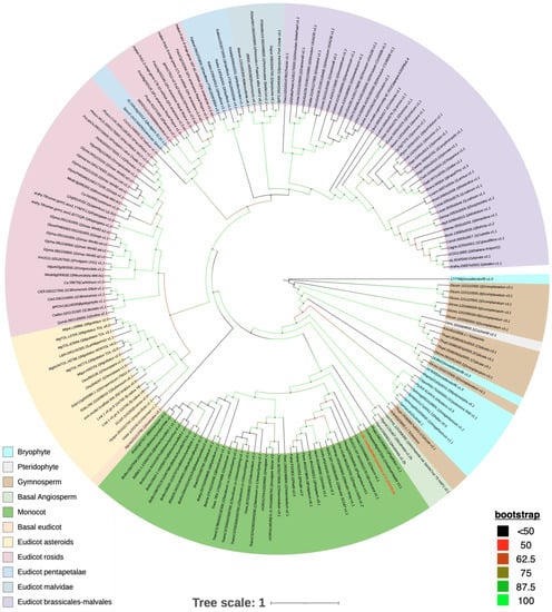 Phylogenetic tree of OsGSL5 homologues across the plant kingdom. The protein sequence of OsGSL5 was obtained from RAPDB and blasted as a query sequence to obtain its homologues across diverse plant groups on phytozome and NCBI (for gymnosperm homologues) blast search tools with the lowest E-value threshold (1 × 10−4). A total of 417 protein sequences were extracted and fed into the NCBI conserved domain search tool with the conserved domain database (CDD) search parameter that imports domain and protein family alignment models from Pfam, SMART, COG, PRK, and TIGRFAMs, in addition to including NCBI-curated domains and data. An e-value threshold of 1 × 10−4 was used for the analysis. Only the sequences with full domain composition (see main text) were selected for phylogenetic analyses. For protein sequences obtained from Phytozome and NCBI-PSI-Blast searches and NCBI conserved domain composition information, we advise readers to see Supplemental Table S1. Sequences were checked for redundancy, and duplicates were removed by the CD-HIT [116] tool. Multiple sequence alignment is carried out using MAFFT [117]. Aligned sequences were then trimmed using the trimAl [118] tool with a gap threshold of 0.999. A phylogenetic tree was constructed by IQ Tree 2.2.0 by the maximum likelihood method with an ultrafast bootstrap (1000) and SH-aLRT reliability tests, in addition to fast branch reliability evaluation [119]. To simplify the phylogenetic inference, the tree was constructed using 165 protein sequences, each representing a diverse plant species, on the interactive Tree of Life (iTOL) web interface. The phylogenetic tree was interpreted manually.