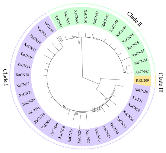 Substantial genetic plasticity exists among Xa strains around the world. A total of 28 Xa strains from 11 different countries can be split into 3 serovars and 6 lysovars for the pathogen [15,16]. Serological diversity of the pathogen has been confirmed using a combination of monoclonal antibodies and DNA fingerprinting of 38 Xa strains from various geographical locations [17]. Pulsed-field gel electrophoresis (PFGE) and multilocus sequence analysis (MLSA) revealed that 218 isolates from 31 geographical locations were clustered into 10 genetic groups (PFGE-A to PFGE-J) [18,19,20]. Our recent studies revealed that the majority of Xa strains in China belonged to PFGE-B [21], while some strains from a novel group were proposed based on MLSA and simple sequence repeats (SSRs) [7,22]. In addition to the MLSA and SSR methods, other fingerprinting tools have also been used to investigate Xa genetic divergence, including restriction fragment length polymorphism (RFLP) [18], random amplified fragment polymorphism (RAPD) [23], rep-PCR [24], and amplified fragment length polymorphism (AFLP) [25]. Recently, whole-genome sequencing of Xa strains was performed on two strains from China [26,27] and four strains from Brazil [28]. These strains were further used together alongside publicly available strains in the NCBI database to explore genomic diversity.