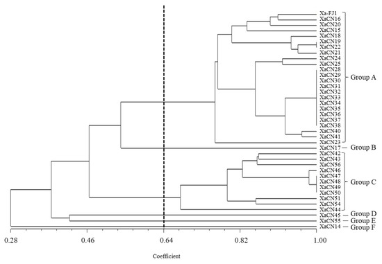UPGMA analysis based on the fingerprints generated from the three aforementioned primer sets showed that the genetic similarity coefficient among the 39 Xa strains ranged from 0.28 to 1.00. When the genetic similarity coefficient was 0.64, these strains could be divided into six groups (Figure 2). Group A was the largest with 24 strains from 6 provinces. Group C was the second-largest with 11 strains (XaCN42–XaCN44, XaCN46–XaCN51, XaCN54, and XaCN56) that originated from the city of Ruian in the Zhejiang province. The individual strain XaCN17 (Wuzhishan, Hainan province) was clustered in group B, while XaCN45 and XaCN55 (Ruian, Zhejiang province) were clustered in groups D and E, respectively, and XaCN14 (Xingyi, Guizhou province) was clustered in group F. PCoA analysis indicated that PCoA 1 and 2 accounted for 73.93% of the total variances. The classification of these 39 strains was identical to the UPGMA analysis (Figure S1).