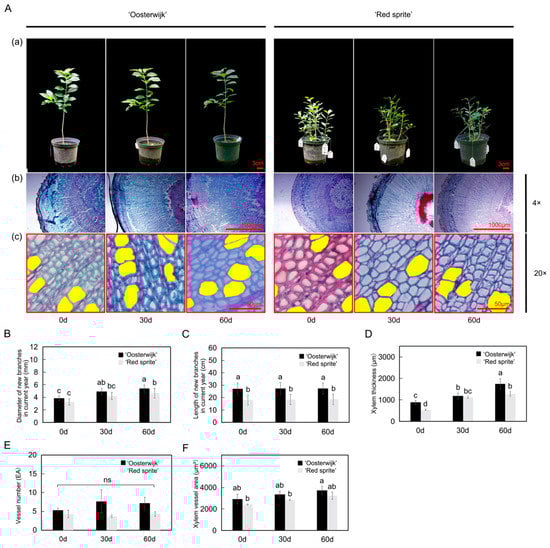 Phenotypic analyses and xylem changes of new branches in the current year of Ilex verticillata ‘Oosterwijk’ and ‘Red sprite’. (A) Observation of the phenotypes. (a) The seedlings of ‘Oosterwijk’ and ‘Red sprite’. Scale bar = 3 cm and (b) observation of the xylem thickness of the two cultivars demonstrates the distance from pith to phloem and the xylem thickness. The sections were observed under a positive fluorescence microscope at ×4 magnification. Scale bar = 1000 μm; (c) observation of xylem vessels of the two cultivars, the yellow area indicates the vessel area. The sections were observed under a positive fluorescence microscope at 20 magnification. Scale bar = 50 μm. (B) Diameter changes of new branches in the current year in two Ilex verticillata cultivars. (C) Length changes of new branches in the current year in two Ilex verticillata cultivars. (D) Xylem thickness in two Ilex verticillata cultivars. The calculation was performed by Image J software based on every three slices. (E) Xylem vessel numbers in two Ilex verticillata cultivars. (F) Xylem vessel area in two Ilex verticillata cultivars. The vessel area was measured by Image J software. Bars represent the mean ± SD of at least three independent experiments. Different letters indicate significantly different values (p < 0.05) by Tukey’s test.