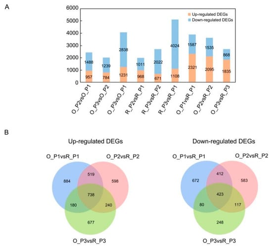 The identification of differentially expressed genes (DEGs) and co-expressed gene modules from WGCNA analysis. (A) Up- and down-regulation DEGs in each comparison group. O_P2 vs. O_P1, O_P3 vs. O_P2, O_P3 vs. O_P1, R_P2 vs. R_P1, R_P3 vs. R_P2, R_P3 vs. R_P1, O_P1 vs. R_P1, O_P2 vs. R_P2 and O_P3 vs. R_P3; O indicates ‘Oosterwijk’ and R indicates ‘Red sprite’; P1, P2 and P3 indicate Phase1 (0 d), Phase2 (30 d) and Phase3 (60 d). The blue bars represent the number of down-regulated genes and the orange bars represent the number of up-regulated genes. (B) Venn plots of up- and down-regulated DEGs in O_P1 vs. R_P1, O_P2 vs. R_P2 and O_P3 vs. R_P3 groups.
