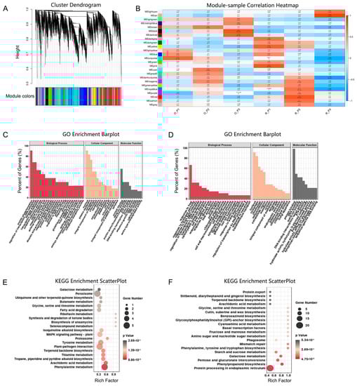 Co−expression module analysis of the transcriptome in stems tissue. (A) Co−expressed gene modules detection by gene cluster dendrograms. (B) Co−expressed gene module−sample associations revealed by the Person correlation coefficient. The leftmost color column indicates different co−expression modules. The number in the figure indicates the correlation between the modules and samples and the numbers in the parentheses are the correlation p values. (C) GO functional enrichment analysis of DEGs in the black module in the O_P3 vs. R_P3 group. (D) GO functional enrichment analysis of DEGs in the tan module in the O_P3 vs. R_P3 group. (E) KEGG enrichment analysis of DEGs in the black module. (F) KEGG functional enrichment analysis of DEGs in the tan module. O indicates ‘Oosterwijk’ and R indicates ‘Red sprite’; P3 indicates Phase3 (60 d).