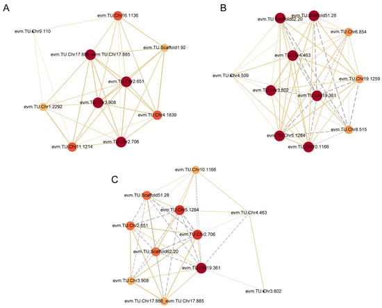 Correlation network analysis based on the DEGs in two modules in the O_P3 vs. R_P3 group. (A) Correlation network of screened DEGs in the black module. (B) Correlation network of screened DEGs in the tan module. (C) Correlation network of screened hub DEGs in two modules. O indicates ‘Oosterwijk’ and R indicates ‘Red sprite’; P3 indicates Phase3 (60 d). The size and color of the circle represent the centrality of the gene. The centrality from blue to red increases gradually. The solid yellow lines reveal positive relations and the grey dotted lines reveal negative relations.