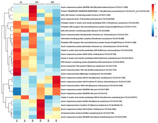 Heatmap of DEGs related to the auxin signaling pathway in the O_P1 vs. R_P1, O_P2 vs. R_P2 and O_P3 vs. R_P3 groups. O indicates ‘Oosterwijk’ and R indicates ‘Red sprite’; P1, P2 and P3 indicate Phase1 (0 d), Phase2 (30 d) and Phase3 (60 d). A scale indicating the color assigned to is shown to the right of the heatmap.