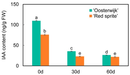 IAA content in the stem of ‘Oosterwijk’ and ‘Red sprite’. Bars represent the mean ± SD of at least three independent experiments. Different letters indicate significantly different values (p < 0.05) by Tukey’s test.