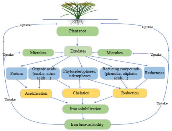 In Fe-limiting situations, plants and soil microorganisms have used active strategies to enhance soil iron availability, which plays a key role in promoting iron absorption. In the rhizosphere, iron oxides are more easily soluble and dissolvable due to processes such as acidification, chelation, and reduction (Figure 1).
