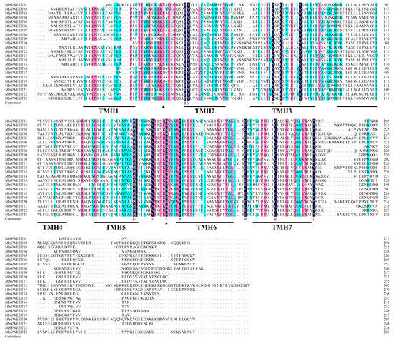 Figure 2. Amino acid sequence alignment results of 23 conserved domains of SWEETs in M. polymorpha. The positions of the seven transmembrane domains (TMH1 to TMH7) are represented by black line segments. The serine phosphorylation sites are represented by black triangles. The residues indicated in black were fully conserved among all proteins.