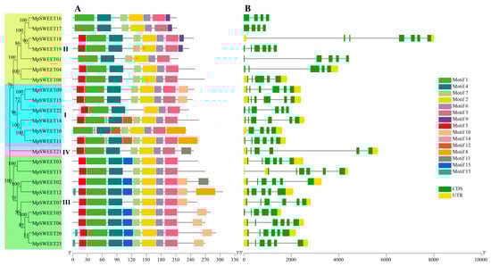 The MEME server identified 15 conserved motifs in MpSWEET proteins. As shown in Figure 3A, most members of MpSWEET proteins contain motifs 1, 2, 3, 4, 5, 6, and 7, indicating that these motifs are highly conserved structures in the MpSWEET transporters. Except for MpSWEET01, MpSWEET10, MpSWEET16, and MpSWEET17, the MpSWEET members contain motifs 5, indicating that these gene family members may lose this motif in the process of differentiation from their common ancestor. Generally, MpSWEET proteins with similar motifs composition tend to cluster together. Motif 12 and motif 14 exist only in Clade I, motif 9 exists only in Clade II, and motif 13 and motif 15 exists only in Clade III. In addition to the seven highly conserved motifs, MpSWEET21 (Clade IV) also contains one specific motif 11. Motif 8 and motif 10 only appear in Clade I and III. It can be seen that the four Clades members of the evolutionary tree contain their specific motifs, indicating that our classification is reasonable.