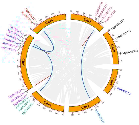 To investigate the relationship between gene duplication and genetic divergence within the MpSWEET genes, we determined the chromosomal locations of MpSWEET genes. The results showed that most MpSWEET genes were located proximal or distal to chromosomes, with Chr2 having the highest number of MpSWEET, with nine MpSWEET genes; Chr1 and Chr7 had the lowest number, with only one MpSWEET gene (Figure 4). The synteny regions on all seven chromosomes were analyzed to reveal the MpSWEET gene duplication events. Four pairs of genes (MpSWEET01/18, MpSWEET02/12, MpSWEET09/15, and MpSWEET10/14) were found to be segmentally duplicated, and three pairs of genes (MpSWEET05/06, MpSWEET10/11, and MpSWEET18/19) were assigned to tandem duplication.