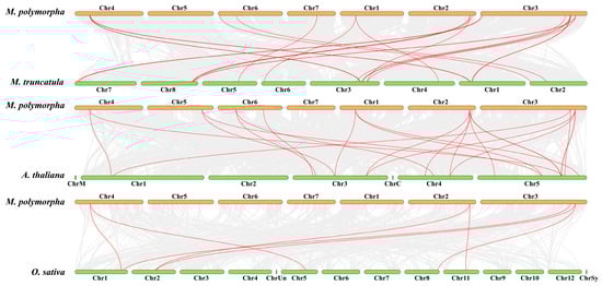 Figure 5. Collinearity analysis between M. polymorpha and A. thaliana, M. truncatula, and O. sative.