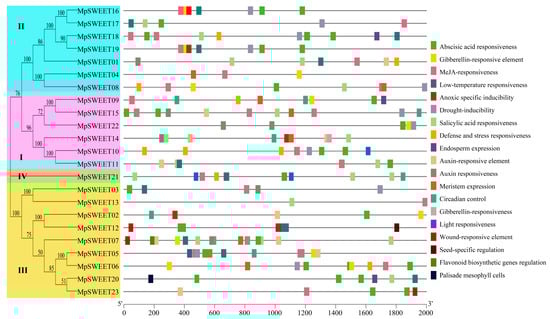 To investigate the potential functions of MpSWEET genes, the sequences of cis-regulating elements related to environmental stress, plant hormones, and plant tissue growth responses in the promoter sequence (2000 bp) of each MpSWEET gene were obtained and analyzed. Six types of phytohormone-responsive cis-elements were identified in the promoter regions of MpSWEET, including two auxin-responsive elements, two gibberellin-responsive elements, one abscisic acid-responsive element, one salicylic acid-responsive element, and one MeJA-responsive element (Figure 6). Stress-responsive cis-elements were determined, including low temperature, drought, and wounding. Tissue-specific expression elements includ seed-specific regulation elements, meristem expression, endosperm expression, and palisade mesophyll cells. Light response elements includ light responsiveness and circadian control elements. As shown in Figure 6, all MpSWEET genes possess seven types of cis-elements related to hormone response. Wound-responsive elements are only distributed in clade III, including MpSWEET07, MpSWEET12, and MpSWEET23. Flavonoid biosynthetic genes regulation elements were only identified in MpSWEET07. For tissue-specific expression elements, endosperm and meristem-specific expression elements are distributed in clades I, II, and III; seed-specific regulation elements and Palisade mesophyll cells were only identified in MpSWEET12 and MpSWEET20 of clade III, respectively. Members of clade II do not contain the circadian control element; only the light responsiveness element was identified.