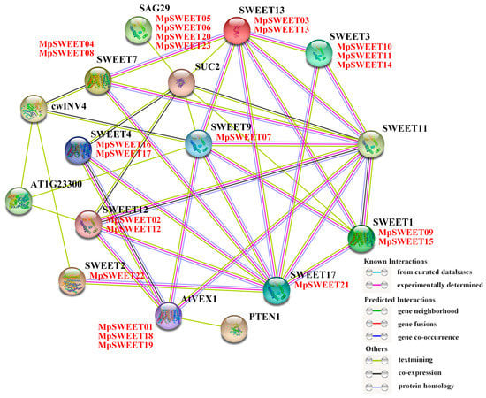 Figure 7. Protein interaction networks of 23 MpSWEET proteins based on orthologs in A. thaliana. Red font means orthologous MpSWEET proteins in A. thaliana.