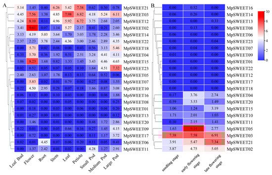 Figure 8. Expression patterns and hierarchical clustering of MpSWEET genes. (A) The expression levels of the orthologs in M. truncatula of MpSWEET genes in different tissues; (B) the expression profiles of MpSWEET genes at three developmental stages.