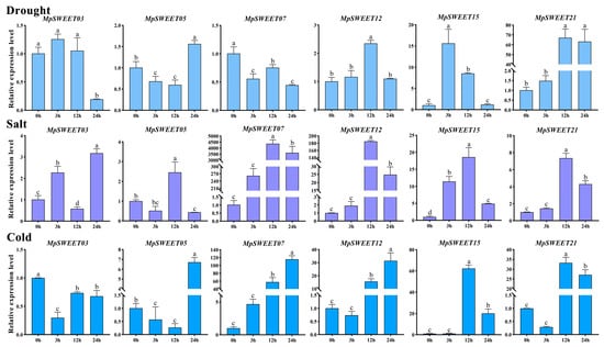 Combining the results of protein interaction networks and expression patterns, six genes (MpSWEET03, MpSWEET05, MpSWEET07, MpSWEET12, MpSWEET15, and MpSWEET21) were selected to examine expression profiles via qRT-PCR in leaf under drought, salt, and cold stresses. As shown in Figure 9, the expression of the selected MpSWEET genes was significantly changed by the three stress treatments. Among the six MpSWEET genes, MpSWEET03 showed significantly lower expression levels under drought stresses (24 h) and cold stresses than the control. MpSWEET05 showed similar expression patterns under drought and cold treatments and peaked at 24 h. MpSWEET07 and MpSWEET12 showed similar expression levels under salt and cold stress treatments, respectively. MpSWEET07 was expressed the highest at 12 h salt stress, with an expression level about 4000 times that in control. The expression of MpSWEET15 and MpSWEET21 were significantly upregulated under three stress treatments (Figure 9), consistent with RNA-Seq data (Figure S2). MpSWEET21 showed similar expression levels, with an expression level at 12 h drought stress nearly 70 higher than that in control.