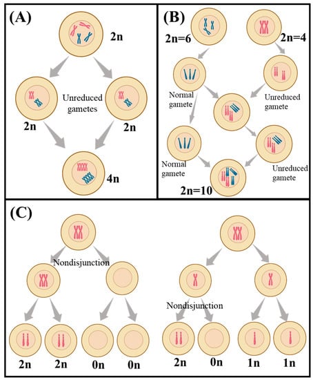 A schematic view of different polyploidization including (A) autopolyploidy, (B) allopolyploidy, and (C) aneuploidy. The schematic was created by using BioRender.com.
